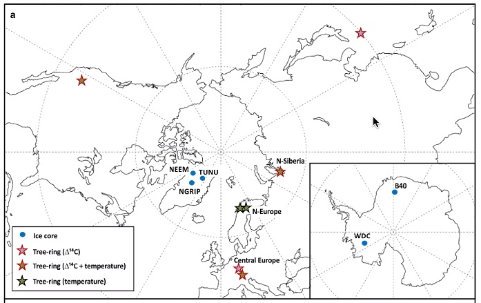Les chercheurs ont ensuite établi une liste de sources écrites et datées. Celles-ci décrivent soit une éruption, soit un ciel rougi, un soleil pâle ou un effet optique appelé « anneau de Bishop » qui sont les conséquences d’une telle éruption. Certaines de ces sources, antiques ou médiévales, ont même dû être traduites. Grâce à ces témoignages, l’équipe a pu établir une chronologie précise et associer des dates aux éruptions présentes dans les carottes de glace. D’autres évènements indépendants ont permis de confirmer cette chronologie : par exemple, un événement céleste laissant des traces identifiables dans la glace et dans les cernes des arbres en 774-775. Les précédentes échelles de temps glaciaires ont ainsi été ajustées de plusieurs années.