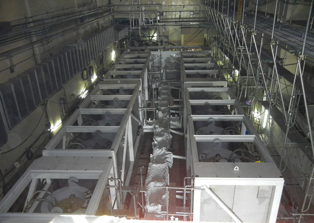 Quant aux piscines situées en hauteur des bâtiments et utilisées pour entreposer les combustibles usés ou arrêtés pour maintenance (comme dans le cas du réacteur 4), elles sont désormais refroidies en circuit fermé et la température de l’eau est maintenue en dessous de 40°C. La piscine du réacteur 4, très endommagée lors de la catastrophe, continue néanmoins d’être refroidie par un apport d’eau supplémentaire. Tepco a engagé des travaux de renforcement de cette piscine (pose de piliers en acier, coulage de béton). Un renforcement des structures des autres piscines est prévu au cours des prochains mois.