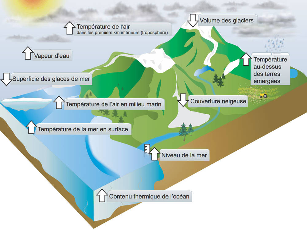 Plus de place au doute, le rapport décrit le réchauffement climatique comme « sans équivoque ». Les tendances observées par les scientifiques depuis les années 1950 en attestent : augmentation moyenne des températures en surface (dans l’atmosphère et dans les océans), réduction des glaciers et des étendues enneigées, ou encore élévation du niveau de la mer. Ces variations découlent des concentrations croissantes, dans l’atmosphère, de gaz à effet de serre (GES) tels que le méthane, le dioxyde de carbone (CO2) ou le protoxyde d’azote.