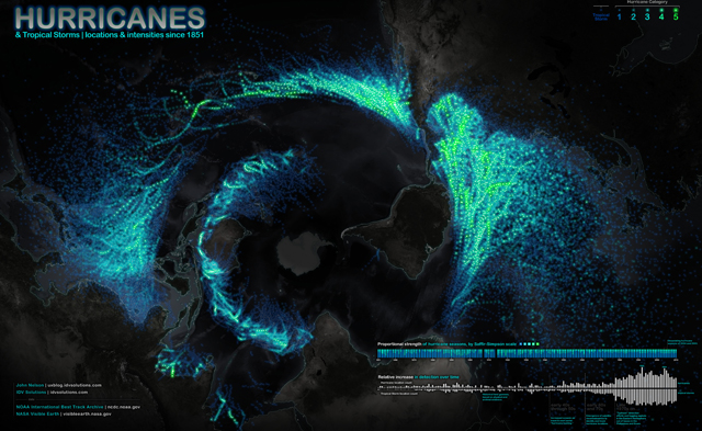 Cette carte représente tous les ouragans qui ont sévi depuis 1851. Observe-t-on une augmentation du nombre d’ouragans dans le monde ?