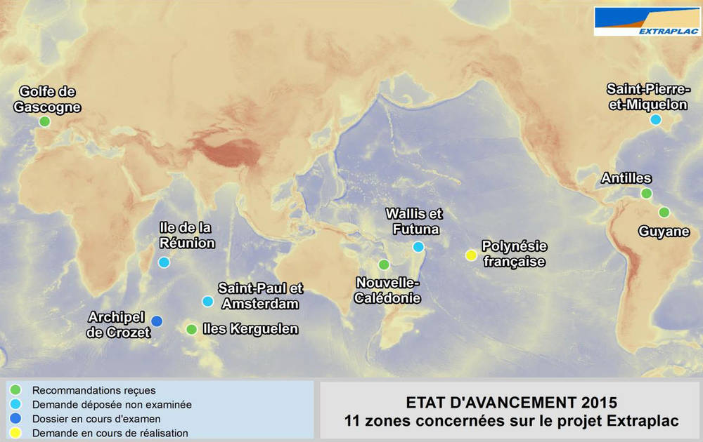 Pour obtenir l’accord des Nations unies sur ces extensions de territoire, la France a mis en place depuis 2002 un programme dédié : Extraplac (pour EXTension Raisonnée du PLAteau Continental). L’Ifremer pilote la contribution scientifique, en collaboration étroite avec le Shom (Service hydrographique et océanographique de la marine), l’IFP énergies nouvelles (Institut français du pétrole) et l’Ipev (Institut polaire français Paul-Émile Victor). Ces organismes apportent les compétences scientifiques et les moyens navals nécessaires à l’élaboration des dossiers.