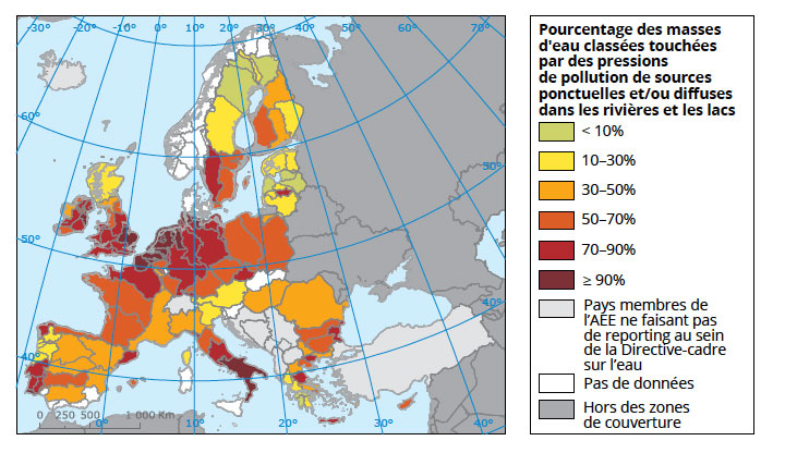 Pis encore, si la concentration moyenne en phosphates et nitrates des rivières européennes a diminué (57 et 20 % respectivement entre 1992 et 2011), l’AEE estime que « ce résultat reflète les améliorations obtenues grâce au traitement des eaux résiduaires et à la diminution de la quantité de phosphore dans les lessives, plutôt que celui des mesures prises pour réduire les intrants agricoles de nitrates à l’échelle européenne et nationale ».