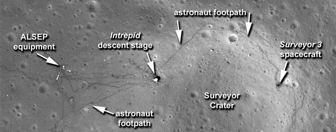Voici par exemple le site de la mission Apollo 12 (1969). Les traces au sol ne sont rien d'autre que les pas des astronautes :