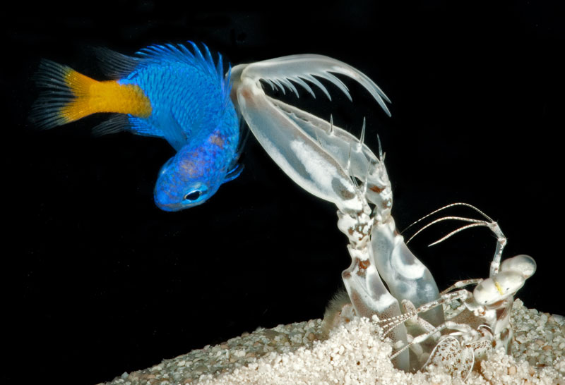 Ce n’est pas le cas chez les squilles. À la grande surprise des chercheurs, les stomatopodes sont incapables de distinguer des couleurs proches. Par exemple, ils ne font pas la différence entre un orange clair et un jaune foncé. En revanche, la reconnaissance des couleurs nécessite une analyse cérébrale extrêmement faible. Ce que le crustacé perd en nuance, il le gagne en rapidité d’analyse ! Et en la matière, les squilles sont beaucoup plus rapides que beaucoup d'animaux.