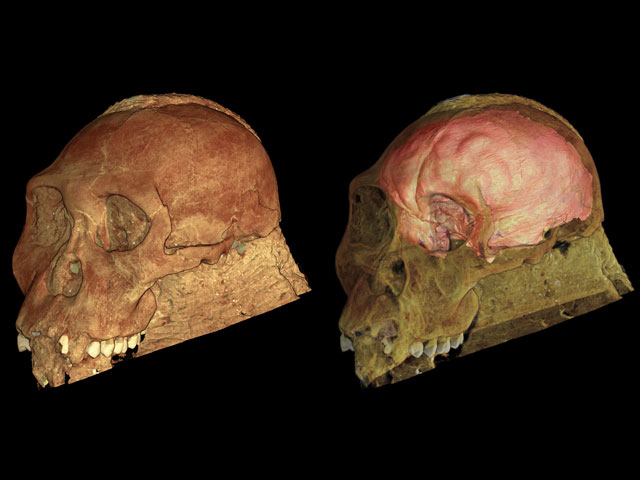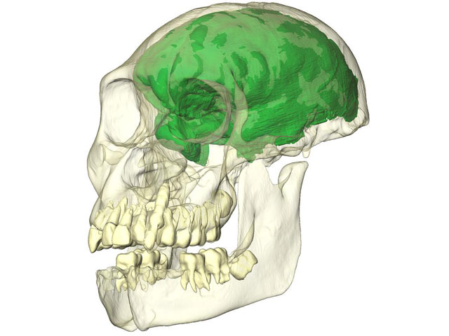 Résultat : une image scanner d’une précision inégalée pour une boîte crânienne d’un ancêtre de l’homme, montrant des détails de 45 microns, c’est-à-dire moins que l’épaisseur d’un cheveu ! Or, en étudiant cette image de l’intérieur du crâne, dans lequel le cerveau a laissé son empreinte, les chercheurs ont tout d’abord calculé que son volume ne dépassait pas 420 cm3 (l’équivalent d’un pamplemousse), c’est-à-dire moins que celui des chimpanzés actuels. Mais surtout, que son organisation neuronale, révélée par sa forme, le rapprochait clairement du genre Homo. Avec en particulier un cortex frontal, siège des pensées les plus élaborées, bien marqué, et dont le lobe droit est un peu plus volumineux que le gauche.