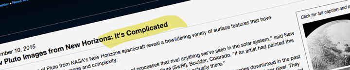 Les premières images à nous parvenir sont les plus détaillées jamais réalisées de la planète naine, les meilleures d’entre elles atteignant une résolution de 440 mètres par pixel. Elles confirment ce que les premiers clichés en basse résolution avaient révélé : Pluton est un monde d’une richesse et d’une complexité que personne n’avait imaginées. Les chercheurs de la Nasa le reconnaissent eux-mêmes : « Pluton, c’est compliqué… »