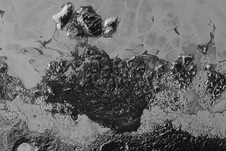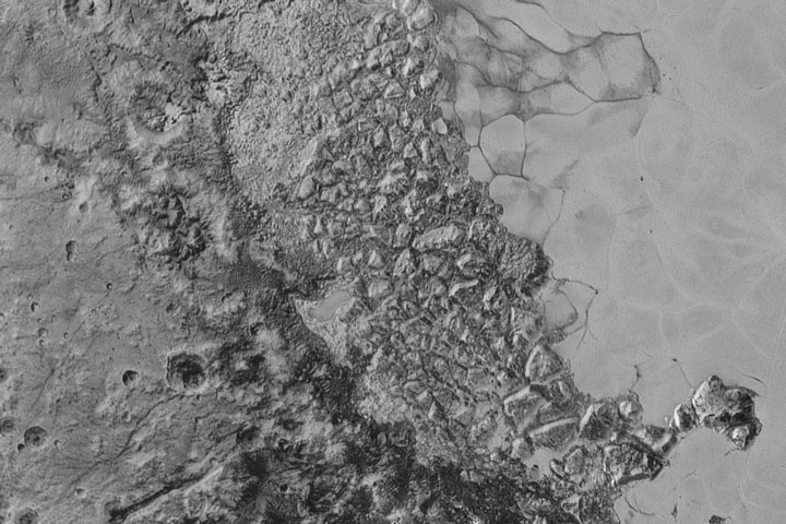 D’autres images laissent apparaître des régions chaotiques semblables à celles que l’on peut observer sur Europe, l’un des principaux satellites de Jupiter. Il s’agit vraisemblablement de blocs de glace s’entrechoquant sur un lit d’azote plus dense. Les observations faites sur Pluton tendent à indiquer que cette planète a un noyau dense entouré d’une épaisse couche de glace, ce qui accroît les possibilités d’existence d’un océan liquide situé sous la glace.