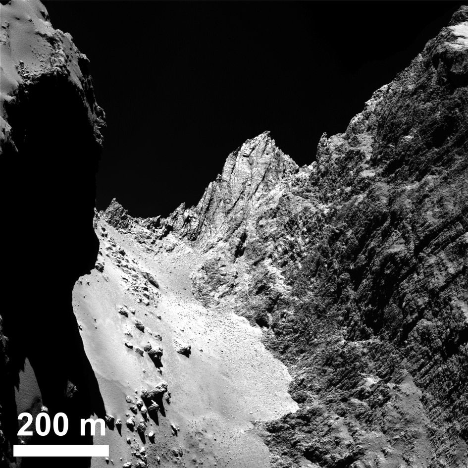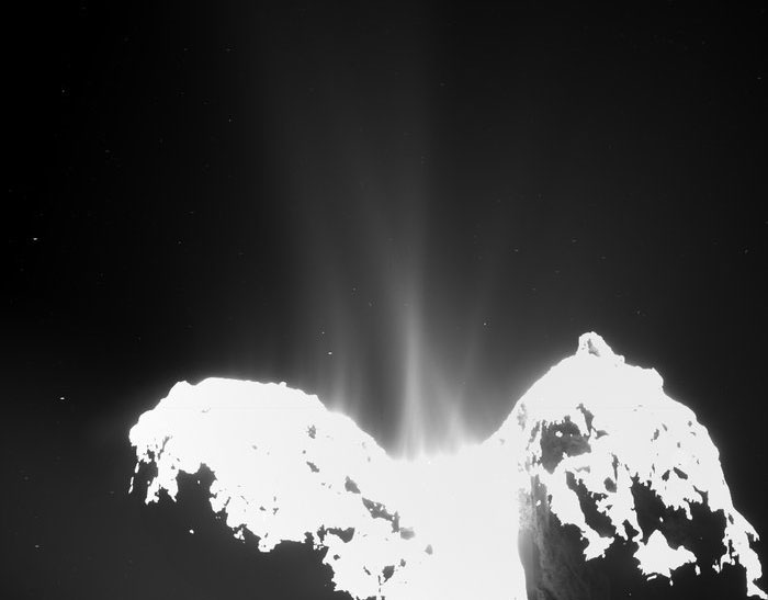 Surprenante à si grande distance du Soleil, l’activité de la comète se concentre actuellement dans la région du « cou » : c’est là que se dissipe l’essentiel de la glace d’eau de 67P. Et ce, d’une manière très irrégulière, puisque le volume d’eau s’échappant de la surface varie d’un facteur 5 selon les variations de luminosité et autres facteurs. La comète « perdrait » ainsi deux mètres d’épaisseur tous les six ans et demi environ. Mais ce phénomène ne suffit pas à expliquer la configuration de son relief.