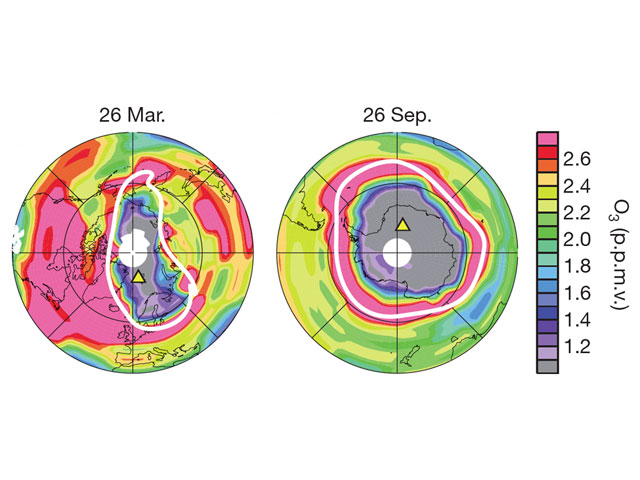 Mais alors, comment expliquer l'apparition soudaine de ce trou d'ozone au nord ? « Par l’augmentation des émissions en gaz à effet de serre », affirme Francis Codron. Et pour cause : pour que l’ozone stratosphérique (20 à 50 km d’altitude) soit détruit, il faut du soleil, des CFC mais aussi une température très basse ; les réactions de destruction ne peuvent en effet se faire qu’à la surface de cristaux de glace. « Or, si les gaz à effet de serre réchauffent l’atmosphère à une basse altitude, ils la refroidissent au niveau de la stratosphère, accélérant le processus de destruction de l’ozone », souligne le chercheur. Ils l’accélèrent d’autant plus que les concentrations de CFC dans cette couche atmosphérique, elles, ne diminueront pas avant une cinquantaine d’années.