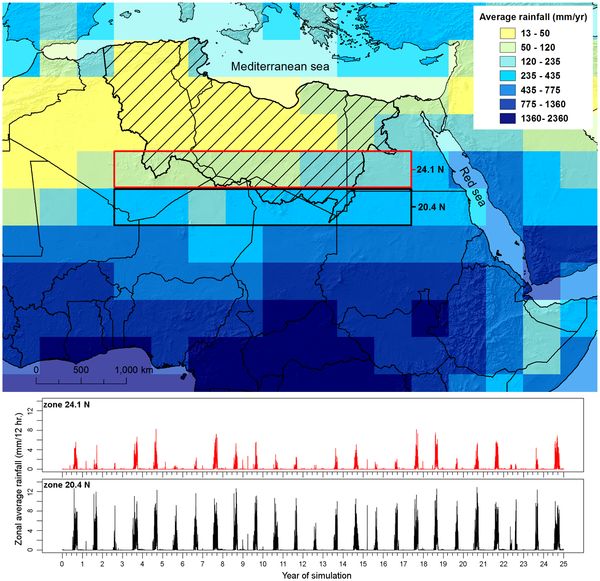 Ils ont effectué une simulation des données climatiques durant la dernière période interglaciaire et élaboré un modèle. Ce dernier révèle que des moussons pouvaient se former à environ 1000 km au nord de l’endroit où elles tombent aujourd’hui, déversant ainsi la pluie sur les montagnes dans le Sahara central (Hoggar et Tibesti actuel). Ces énormes quantités d’eau, associées à la configuration du terrain, offraient des conditions idéales pour alimenter trois grands fleuves de surface, chacun approximativement de la taille du Nil. Ils auraient aussi pu former de vastes zones humides avec de nombreux lacs, sur l'emplacement de la Libye actuelle.