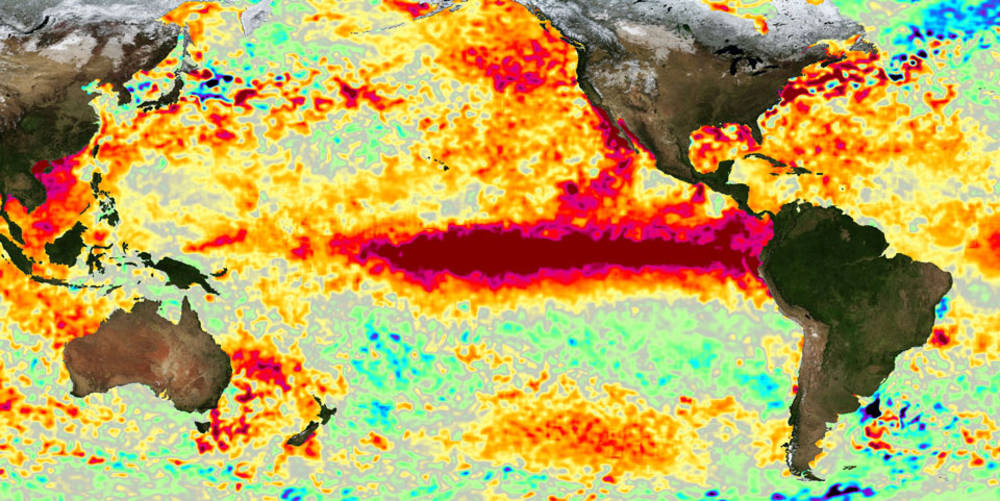 Or l’épisode actuel ne fléchit pas. Avec des anomalies de températures dépassant les 4 °C, il pourrait égaler, voire dépasser, l’épisode historique qui avait été observé en 1997 et 1998. Pour s’en convaincre, il suffit de comparer les récentes images réalisées par le satellite Jason-2 avec celles produites il y a 18 ans par Topex/Poseidon.