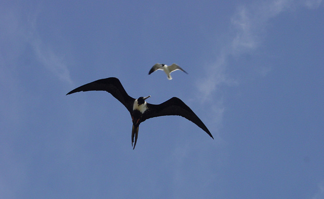 Cette technique de vol, qui limite les efforts physiques de l’animal, est la même que celle utilisée par les oiseaux migrateurs au cours de leur long voyage au-dessus des terres. Sauf que ces derniers évitent de survoler les mers car les courants ascendants n’existent pas au-dessus de l’eau. Mais ce n’est pas le cas dans les régions tropicales où la mer est assez chaude pour en produire en permanence. Les frégates, qui vivent dans ces régions, en profitent donc pour voler aussi bien le jour que la nuit, parfois pendant plusieurs semaines, grâce à cette technique.