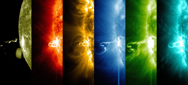 Alors que l’activité solaire est à son maximum, une éruption exceptionnelle s’est produite à la surface de notre étoile le 25 février dernier. En orbite autour de la Terre depuis 2010, le satellite américain SDO, spécialisé dans l’observation du Soleil, a assisté à l’événement, si bien que l’éruption a pu être filmée dans différentes longueurs d’onde.