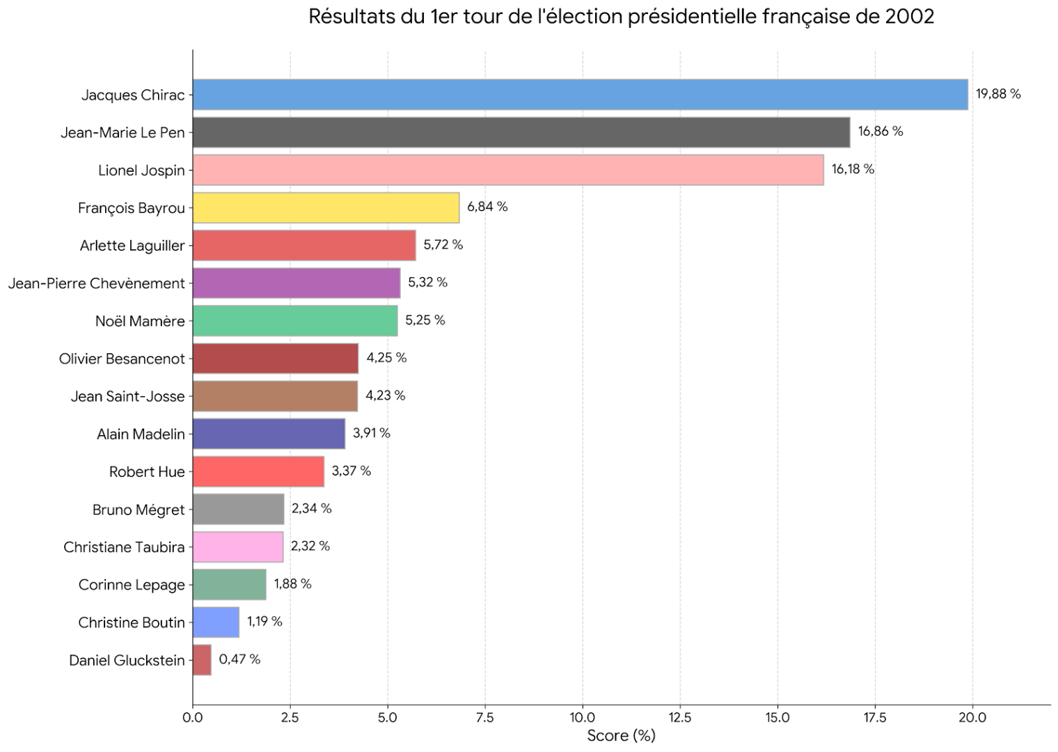 L’un des exemples les plus célèbres est celui de l’élection présidentielle de 2002 avec le premier tour suivant : Jacques Chirac (19,88 %), Jean-Marie Le Pen (16,86 %) suivi par Lionel Jospin (16,18 %). De nombreux électeurs de gauche ont voté au premier tour pour Olivier Besancenot, Arlette Laguiller, Christine Taubira, Jean-Pierre Chevènement, Noël Mamère, soit 22,83 % en tout. Avec Lionel Jospin, la gauche talonne à 39 %. Pourtant, c’est le duel Chirac/Le Pen qui sera au second tour. Il aurait fallu que tous les électeurs de gauche votent pour Lionel Jospin pour obtenir un duel Chirac/Jospin au second tour.